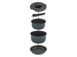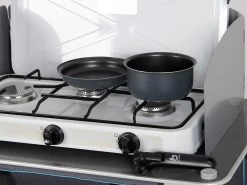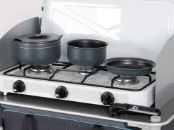 Deze compacte lichtgewicht pannenset van Bo-Camp bestaat uit twee pannen, een koekenpan, een handige afgietdeksel en een losse pannengreep. Deze pannen hebben een poedercoating aan de buitenkant en een anti-aanbaklaag aan de binnenkant. Te gebruiken op de warmtebronnen gas, keramisch en elektrisch.