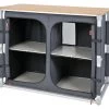 De Bo-Camp kast heeft een lichtgewicht aluminium frame met een polyester bekleding. Zowel het bovenblad als de legplanken zijn gemaakt van MDF en afgewerkt met een aluminium rand. De kast is voorzien van vier verstelbare poten zodat je de kast altijd waterpas kunt zetten op een ongelijke ondergrond. Zodra de vakantie afgelopen is kun je de kast eenvoudig uit elkaar halen en opbergen in de meegeleverde draagtas.