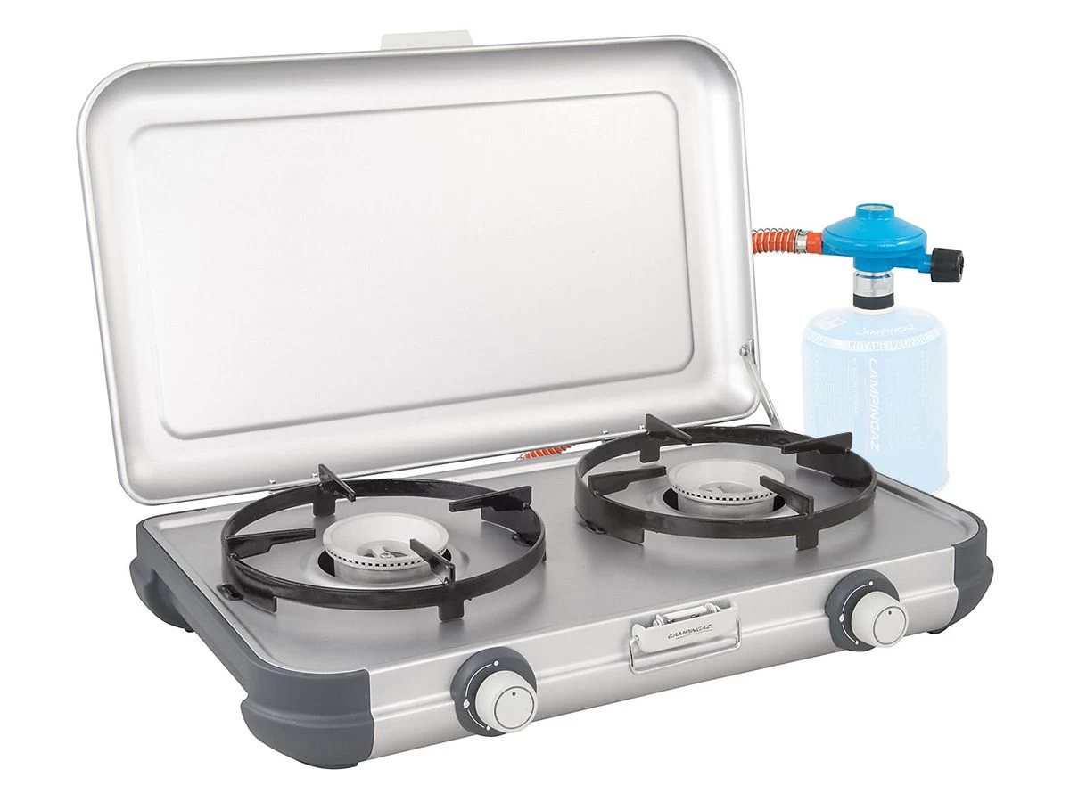 Wil je lekkere en grote maaltijden koken op de camping, maar niet een te groot en te zwaar kooktoestel mee nemen? Maak dan gebruik van dit kooktoestel van Campingaz, hij is voorzien van de Easy Clic PLUS-aansluiting waarmee je gascartouche in slechts enkele seconden aan kunt sluiten of los kunt koppelen. De slang en drukregelaar zijn inbegrepen. Koop er een CV470+ gascartouche bij en je kunt meteen een heerlijke maaltijd koken. Geen gedoe met grote gasflessen maar alles compact bij elkaar.