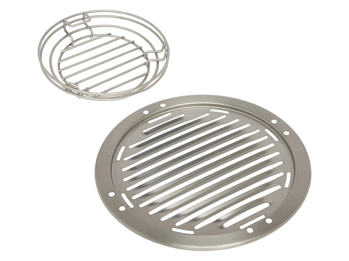 De kit bestaat uit een groot brikettenmandje en een RVS rooster met speciale V-vorm banen. De V-vorm banen in het rooster zorgen ervoor dat de sappen niet verloren gaan, maar terugkomen in het vlees of de vis.