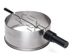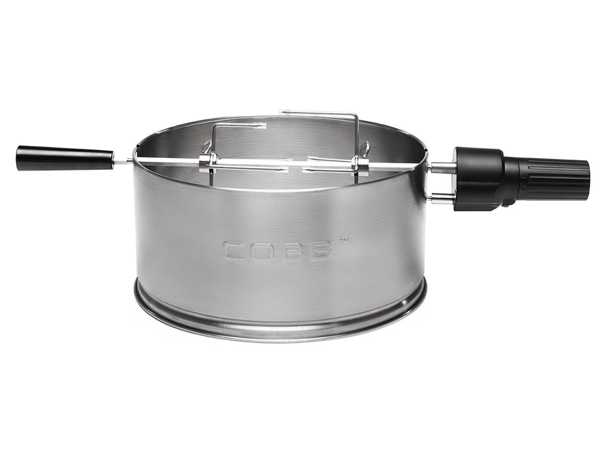 De COBB rotisserie bestaat uit een dekselverhoger, een draaispit met motor en twee pinnen om het ingrediënt mee vast te zetten. Je kan hem direct of indirect (met de basisplaat) gebruiken.