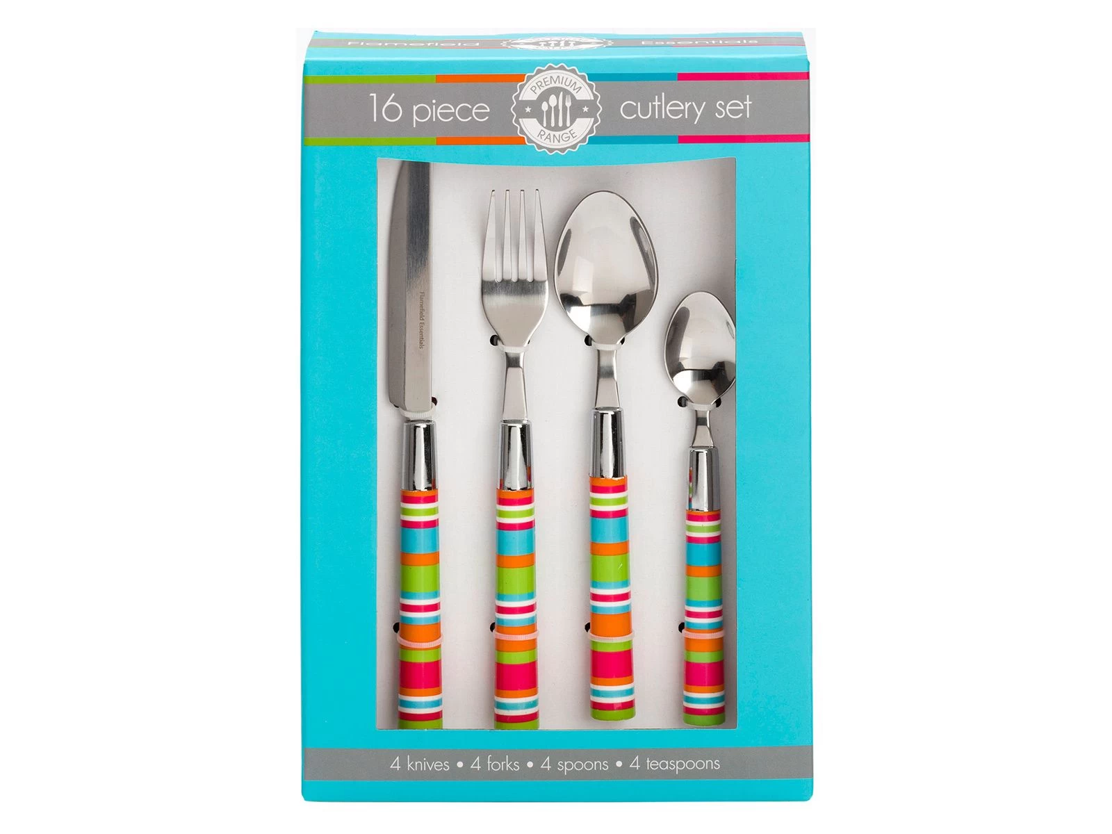 Vind jij de meeste campingspullen zo kleurloos? Dan is deze bestekset van Flamefield waarschijnlijk echt iets voor jou! De set is gemaakt van RVS en heeft een gestreept handvat in allerlei vrolijke kleuren. De bestekset bestaat uit 4 messen (22,5 cm), 4 vorken (20,5 cm), 4 grote lepels (20 cm) en 4 kleine lepels (16 cm). De bestekset is geschikt voor de vaatwasser!