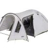 De voorzijde van de Benidorm 4 CoolDark heeft twee grote ramen die zorgen voor veel lichtinval en een ruimtelijk gevoel. Heb je behoefte aan privacy? Dan kun je de ramen van binnenuit volledig bedekken met een afdekflap. Ook aan ventilatie is gedacht. Zo bevinden zich 2 afgedekte ventilatieopeningen boven de ramen aan de voorzijde, en is er een grote overdekte ventilatieopening aan de achterzijde. Dankzij de brede ingang aan de voorzijde en de ruime zij-ingang kun je de Benidorm 4 CoolDark heerlijk doorluchten en kun je zelf kiezen via welke ingang je de tent binnen gaat.
