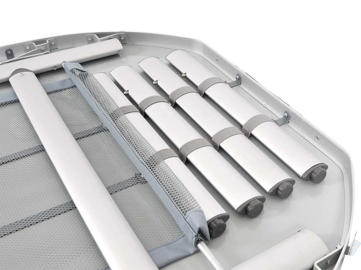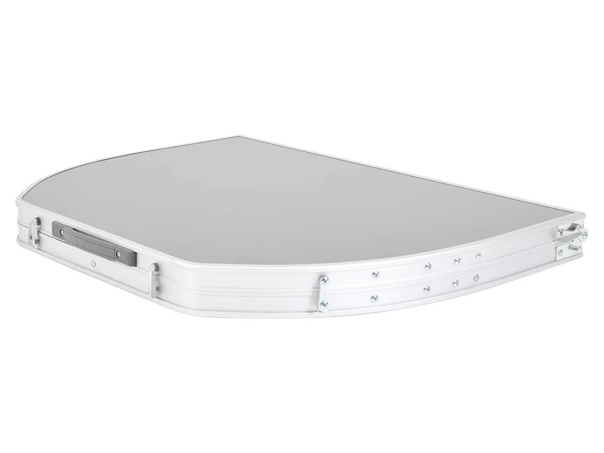 Onder het blad zit een handig lectuurnet zodat je altijd je boek of tijdschrift in de buurt hebt. Na gebruik is de tafel compact op te vouwen, door het deelbare blad kun je de tafel inklappen als een koffer.