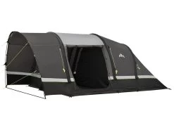 De Columbia 5 Easy Air is dé perfecte tunneltent voor gezinnen met jonge kinderen die op zoek zijn naar een compacte gezinstent óf stelletjes die op zoek zijn naar een ruime tent. De Columbia 5 beschikt namelijk over een 2-persoons en een 3-persoons slaapcabine en dankzij de uitritsbare scheidingswand kun je er ook één grote slaapcabine van maken. Zo kan iedereen gezellig bij elkaar liggen. Ondanks zijn compacte maatvoering is het voorportaal met zijn afmeting van 330 x 195 cm groot genoeg voor bagage, een compacte campingtafel en twee stoeltjes. Dankzij de vaste zonneluifel aan de voorzijde heb je een overdekt voorportaal. Zo kun je de voordeur die voorzien is van een gaasdeur open laten staan zonder dat het direct naar binnen regent. De rechterzijde van de Columbia is ook voorzien van een zijdeur met gaasdeur. Omdat goede ventilatie bijdraagt aan een aangenaam leefklimaat in de tent zit er een grote afgedekte ventilatieopening aan de achterzijde bij de slaapcabines en is de bovenste helft van het zijraam voorzien van horrengaas.