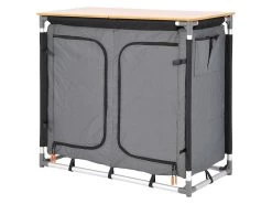 De Lido Bamboo kast heeft een frame van aluminium, een polyester doek en een blad van bamboe. De legplanken in de kast zijn van MDF met een bamboe dessin. Zo is deze campingkast niet alleen praktisch maar ook erg stijlvol!