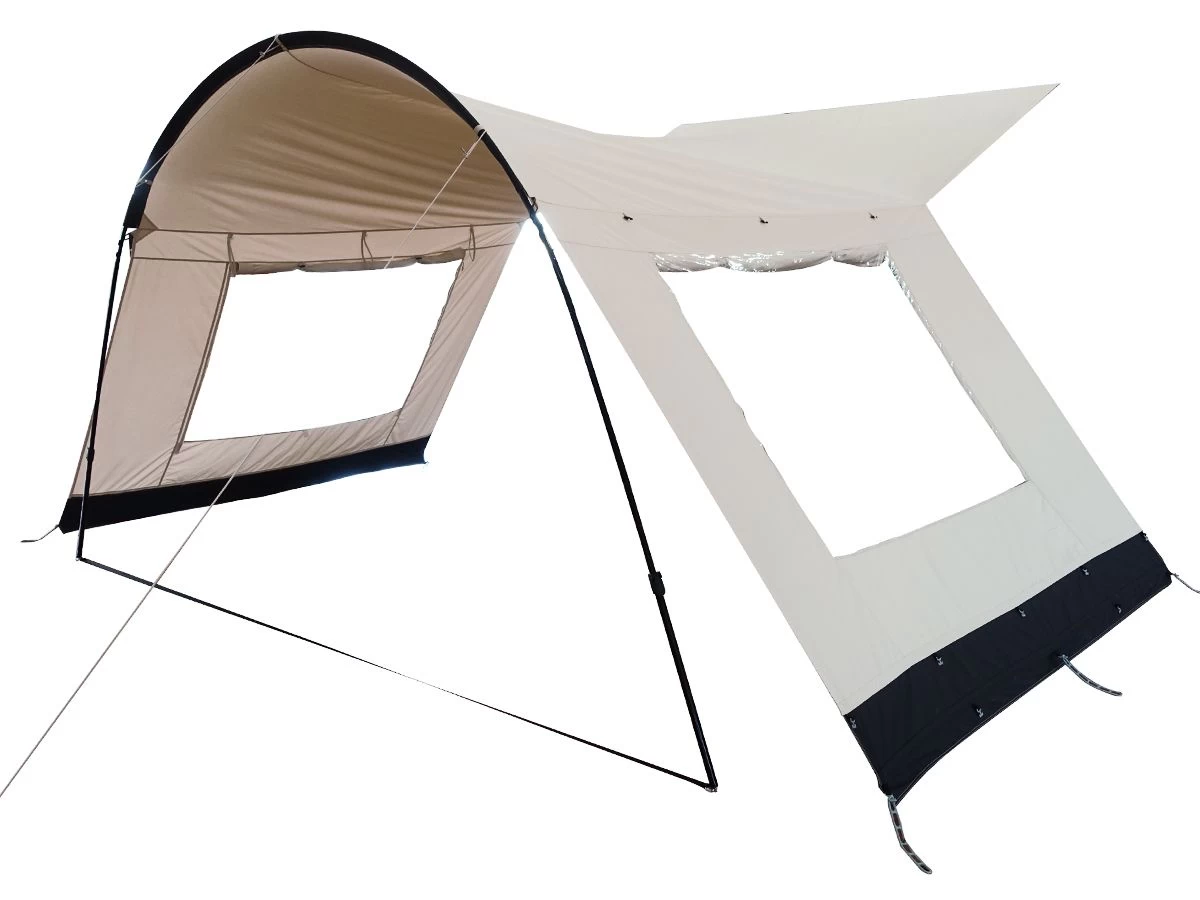 De achterzijde van de luifel is voorzien van een lange aansluitflap die je met de meegeleverde scheerlijnen over bijna elke tent heen kunt spannen. Omdat de zijwanden in de breedte variabel vast zetten zijn kan de luifel op zowel smalle als brede kampeertenten bevestigd worden.