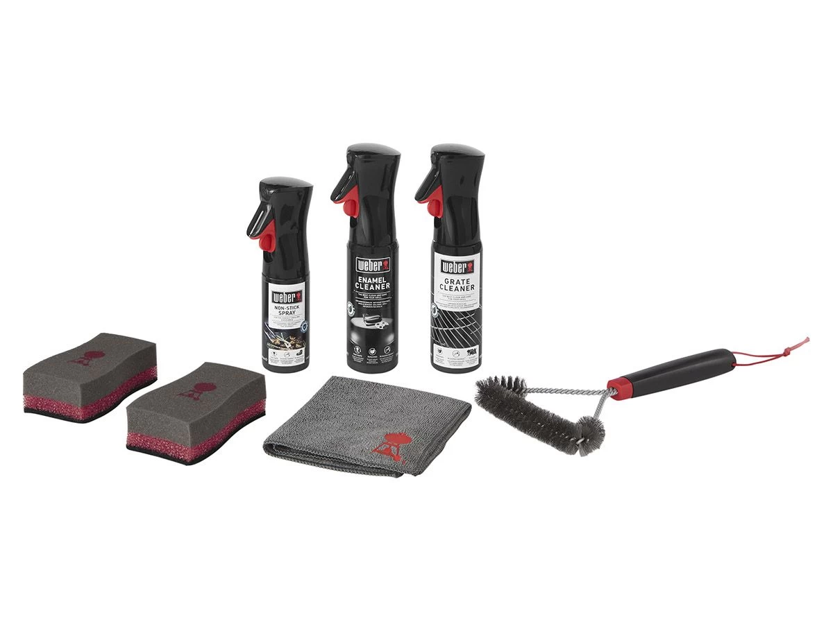 De set bestaat uit een reinigingsborstel van 30 centimeter met stevige en roestvrije borstelharen, een reiniger voor Q en grillrooster, een spons, anti-aanbakspray, emaillereiniger en een microvezeldoek. Dit assortiment zorgt ervoor dat jij je barbecue als nieuw kunt houden.